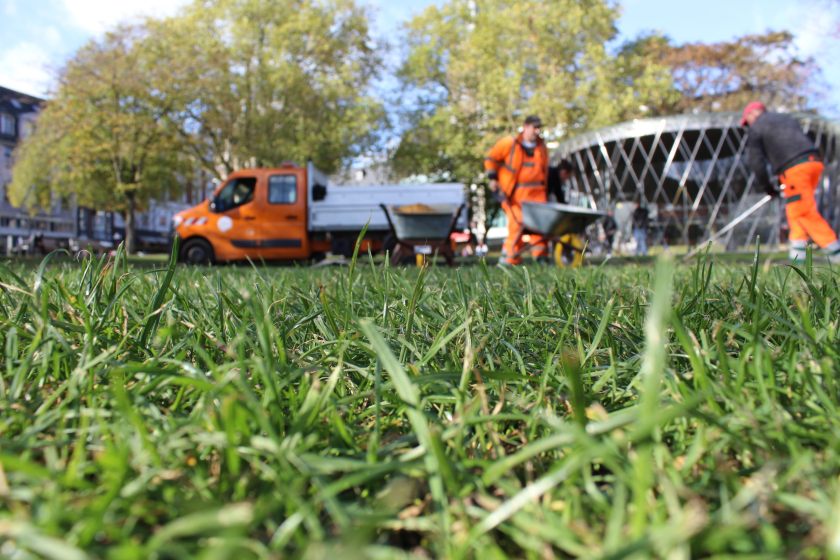Am gestrigen Mittwoch, 2. November, arbeiteten zehn Gärtner*innen des Stadtbetriebs im Elisengarten. Das Presseamt teilt mit: Mit einem Rasenlüfter sei die gesamte Fläche aerifiziert worden. „Es entstehen fingerdicke, etwa fünf Zentimeter tiefe Löcher. Mit Rechen und Rasenkrakeln arbeiten die Gärtner*innen anschließend ein Gemisch aus Dünger und Sand ein.“