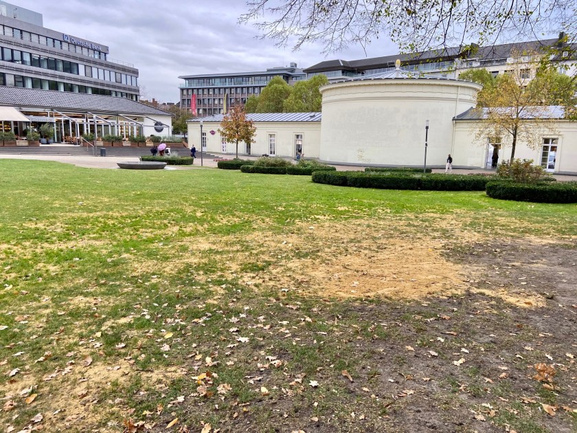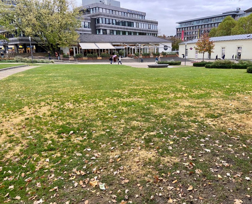 Die Mitarbeiter*innen des Stadtbetriebs müssen sich bei der Gestaltung der einzigen Grünfläche im Zentrum der Stadt die größte Mühe geben. Die Pflege ist komplizierte. Jüngst erst hatte dies eine Rolle gespielt, als u. a. wegen regelmäßiger Zertrampelung des Rasens eine Weihnachtsmarktbude (Hütte 16) dort nicht mehr stehen durfte. Wobei man sich schon immer gefragt hatte, über welche Spezialbeziehungen zur CDU der Hütten-Betreiber aus der Hartmannstraße verfügt, dass er jahrelang seine Bude da aufstellen durfte, wo sonst niemand stehen durfte?