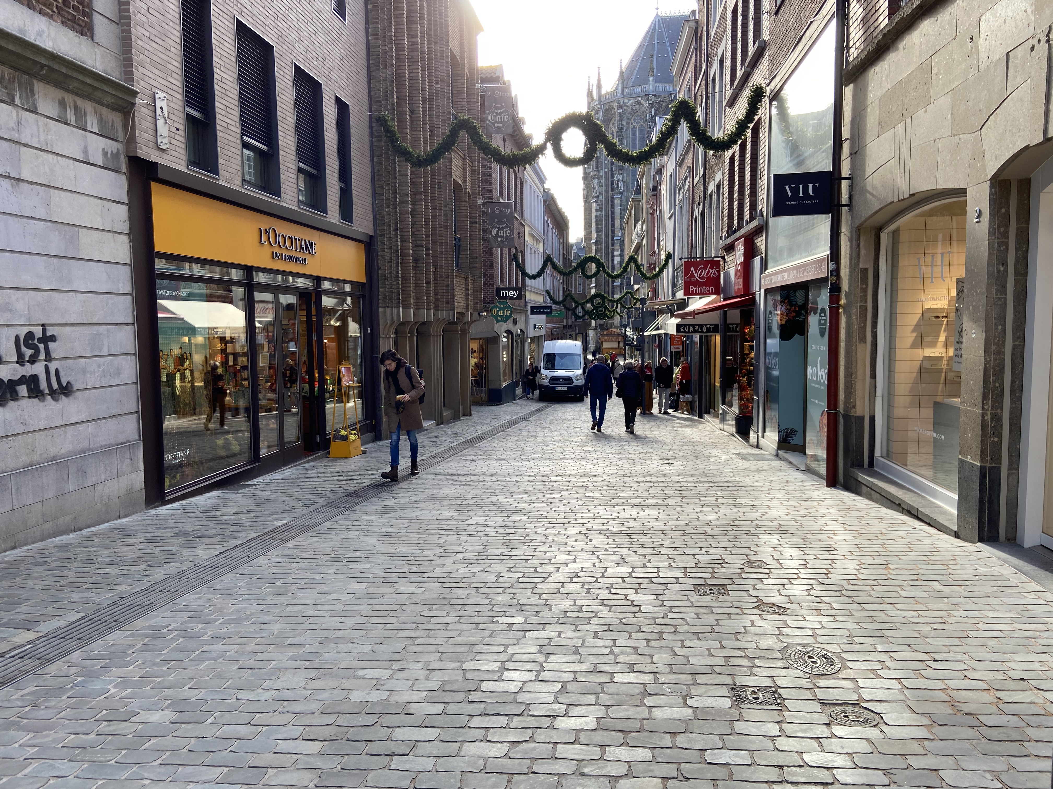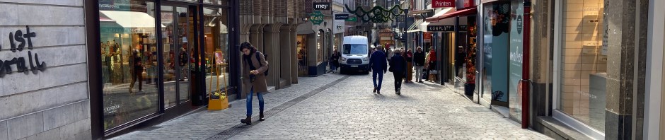 Die Krämerstraße mitten in Aachens Innenstadt ist fast fertig. Es liegen jetzt dort Pflastersteine, über die auch behinderte Menschen gut rüberkommen. Die Straße hat bezüglich ihrem Erscheinungsbild gewonnen, sie sieht etwas eleganter und breiter aus. Wie sie zuvor aussah, das sieht man hier.