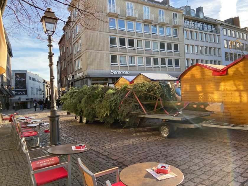 Zum Weihnachtsmarkt gehört ein Weihnachtsbaum. Der wurde gestern nach Aachen gebracht und aufgestellt (s. unten). Es mussten somit dieser Tage drei Bäume dran glauben, zwei Kastanien und ein Nadelbaum.