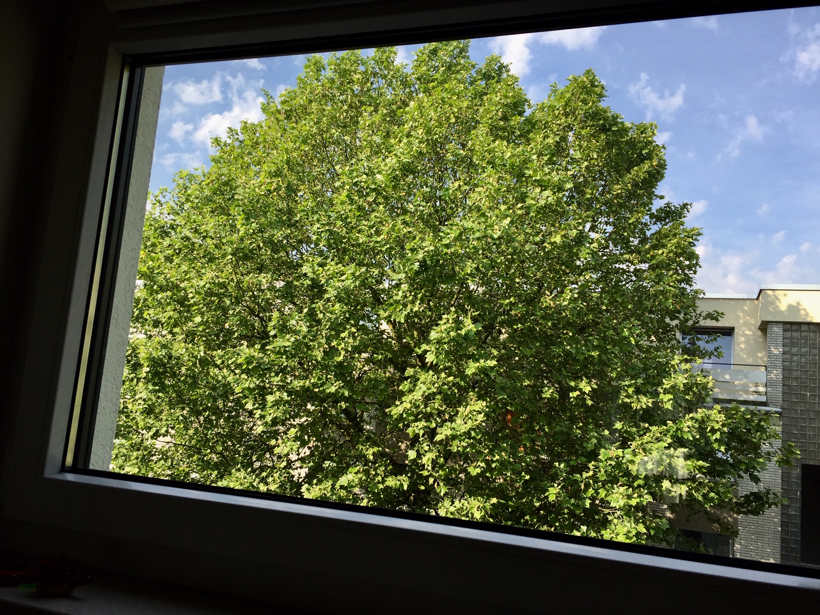 Und so (s. unten) sieht der Baum – und sein Kumpel gleichfalls – bisher noch immer im Sommer aus. Beide Bäume sorgen für massig Schatten, kühle Luft, für rauschen im Wind, den Blick auf eine angenehme Coloration, wenn man aus dem Fenster schaut. Und man kann beim Blick aus dem Fenster erkennen, welche Jahreszeit gerade ist.