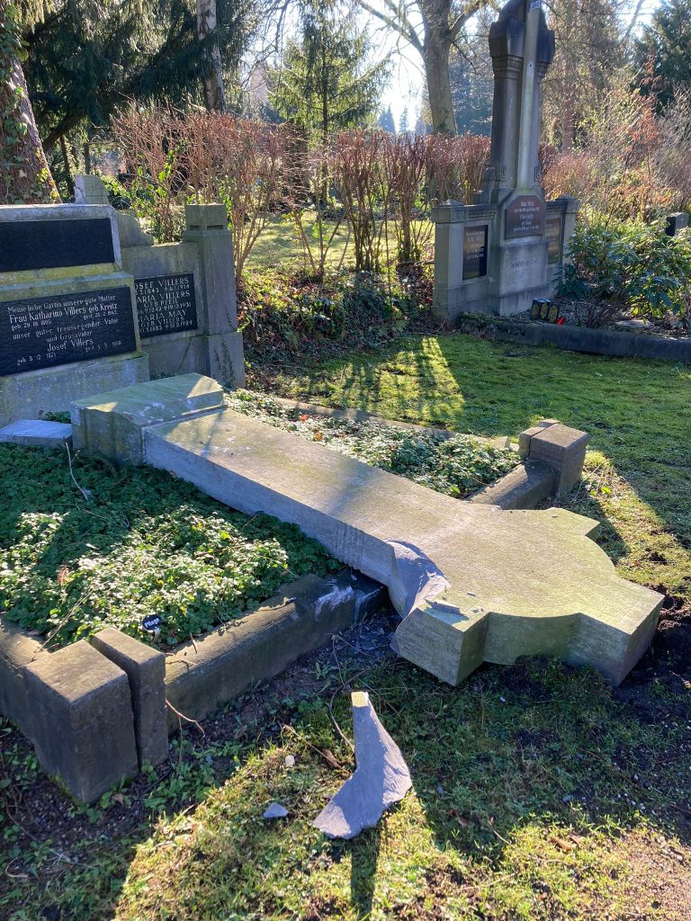 Auf dem Aachener Ostfriedhof sind schon wieder historische Grabdenkmäler zerstört worden. Das musste die Stadtverwaltung jüngst zur Kenntnis nehmen. Der Stadtbetrieb habe bei einem Kontrollgang die Beschädigungen entdeckt. Bei einem der beschädigten Denkmäler seien deutliche Spuren auf der Rückseite des Grabmals zu sehen, „was vermuten lässt, dass Hilfsmittel eingesetzt wurden, um es zu Fall zu bringen“.