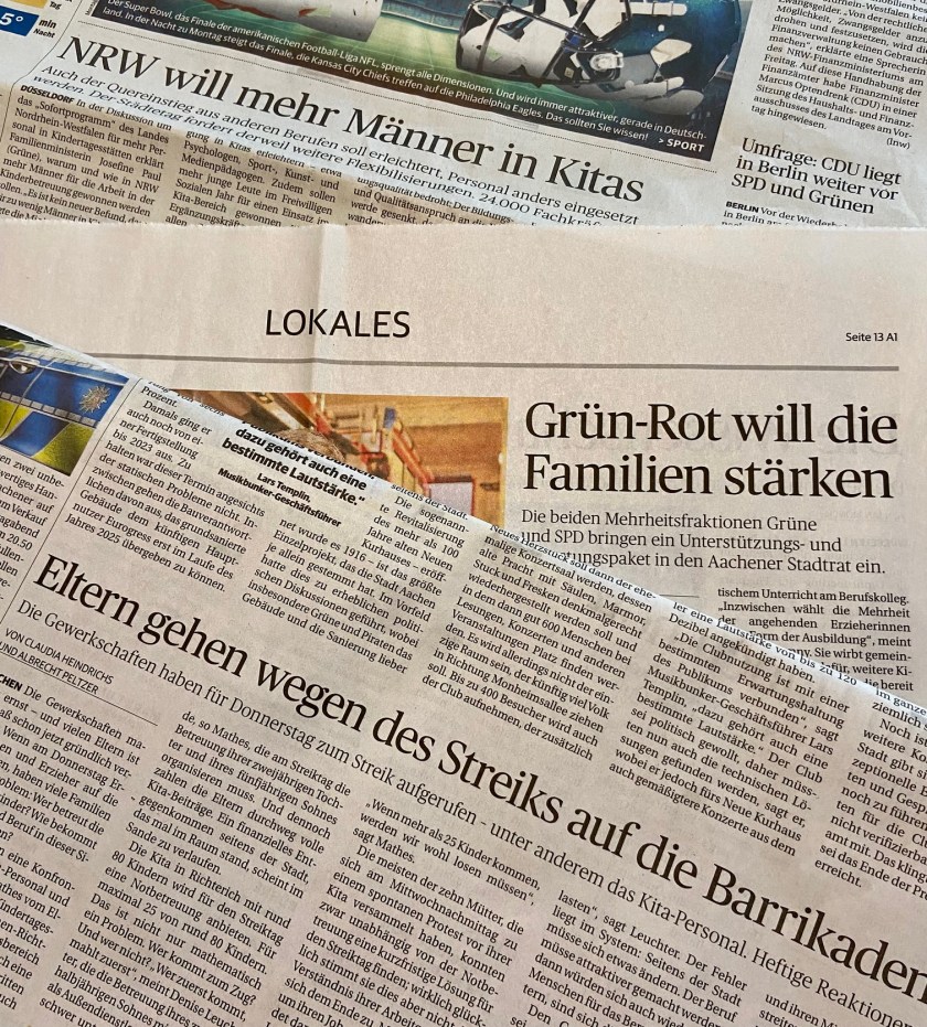 Die Politik in Aachen reagiert auf die – durch Personalmangel – herbeigeführte Katastrophe: Die Arbeit in den Kitas soll auf pädagogisch Ungelernte verteilt werden. Und Verwaltungsarbeiten und Berichte formulieren – das sollen auch andere Menschen in der Stadtverwaltung erledigen. Ob das hilft? Wir wollen es hoffen.