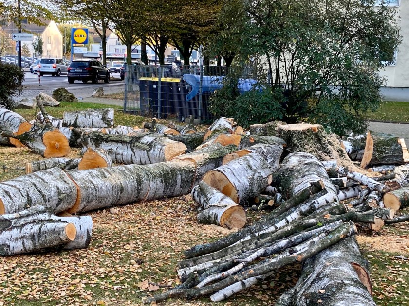Die gefällten Baume an der Trierstr. Sehen so aus, als ob der Baumkern weich ist (dunkle Färbung).