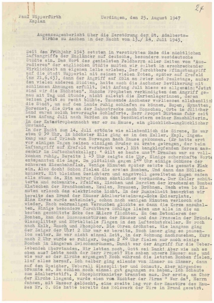Die Ereignisse dieser Bombennacht sind in einem Augenzeugenbericht von Kaplan Paul Wipperfürth festgehalten (s. unten), der im Stadtarchiv aufbewahrt wird und sehr eindrücklich das Erleben eines so großen Luftangriffs beschreibt. Wipperfürth schrieb seine Erinnerungen an diese Nacht im August 1947 nieder.