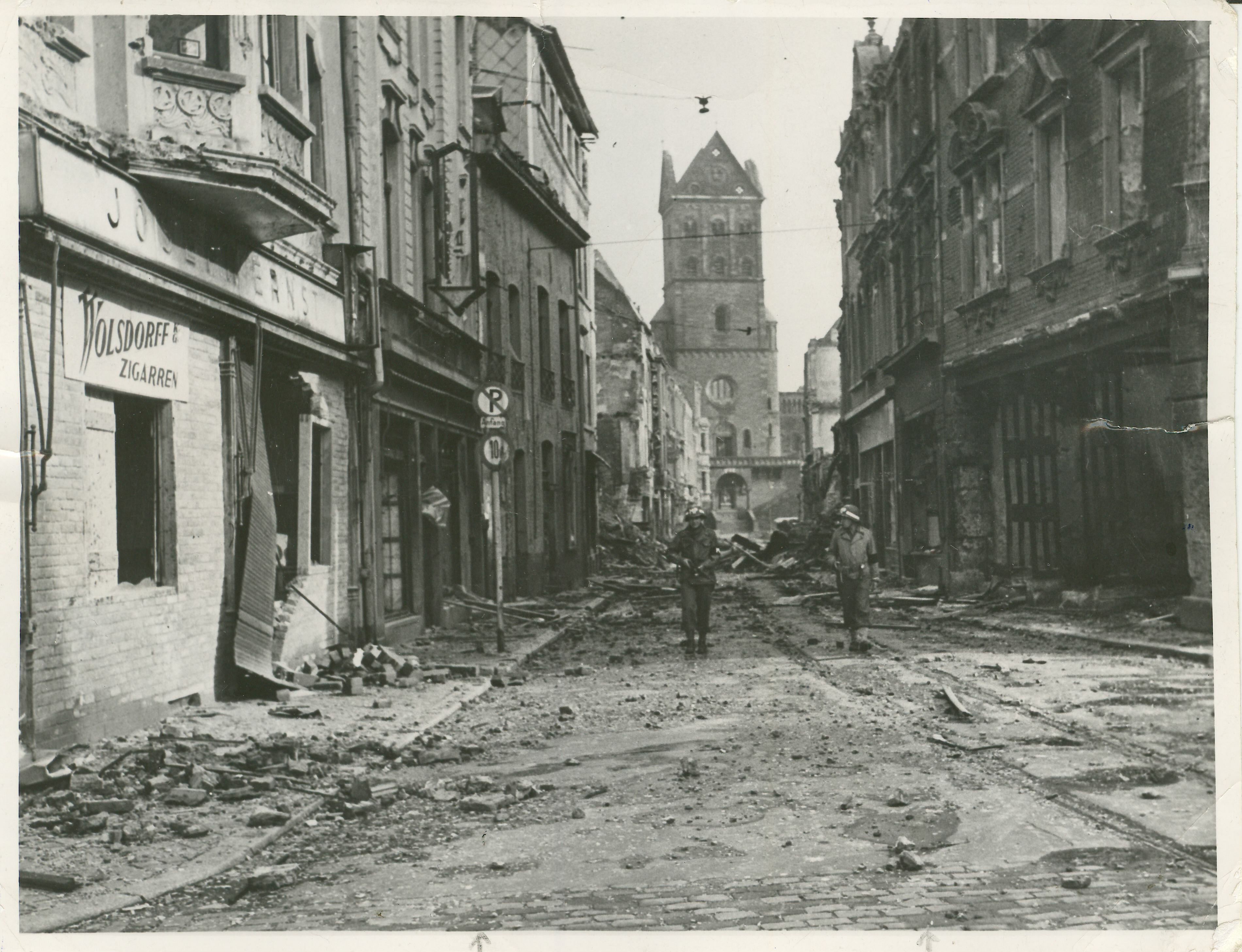 Im Juli 2023 zeigt die Serie „Archivale des Monats“ ein Foto der Adalbertstraße, auf der zwei amerikanische Soldaten im Herbst 1944 patrouillieren. Im Hintergrund: St. Adalbert mit der fehlenden Turmspitze. Der Fotograf ist unbekannt, gehörte aber zum US-Militär. Das Stadtarchiv hat wieder in seinen gigantischen Vorrat alter Dokumente gegriffen und präsentiert ein Foto aus Kriegszeiten. Folgendes wird mitgeteilt: