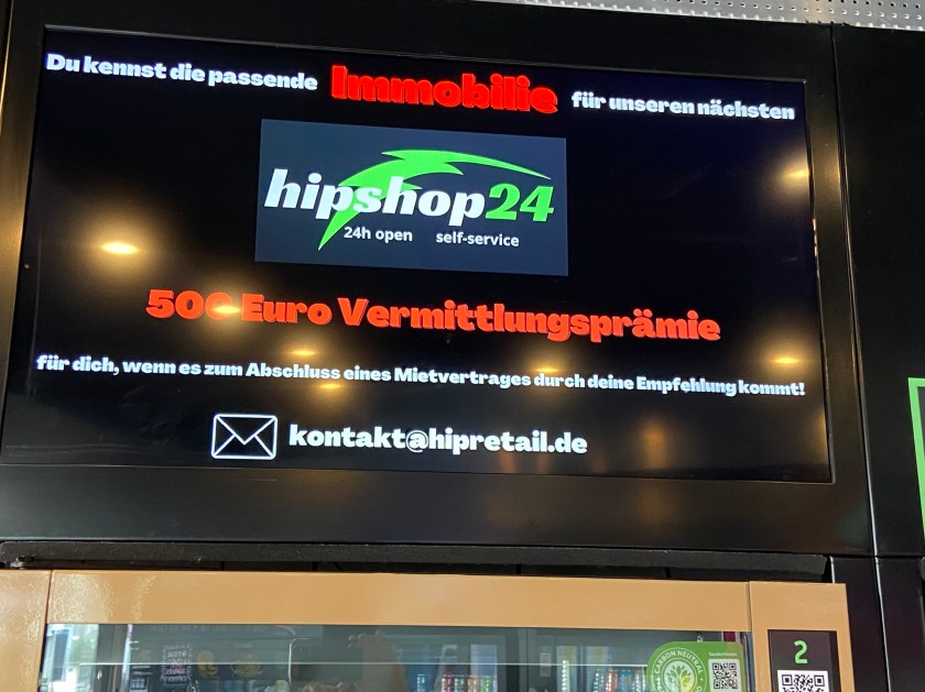 Ein Lebensmittel-Laden, der allen Drinnies sehr viel Freude bereitet, hat in Aachen in der Pontstraße 133 seine Türen geöffnet – und zwar 24 Stunden am Tag, 7 Tage lang. Immer geöffnet ist der Hipshop 24, weil er ohne Personal auskommt. Man kann dort alles aus Automaten rausziehen.