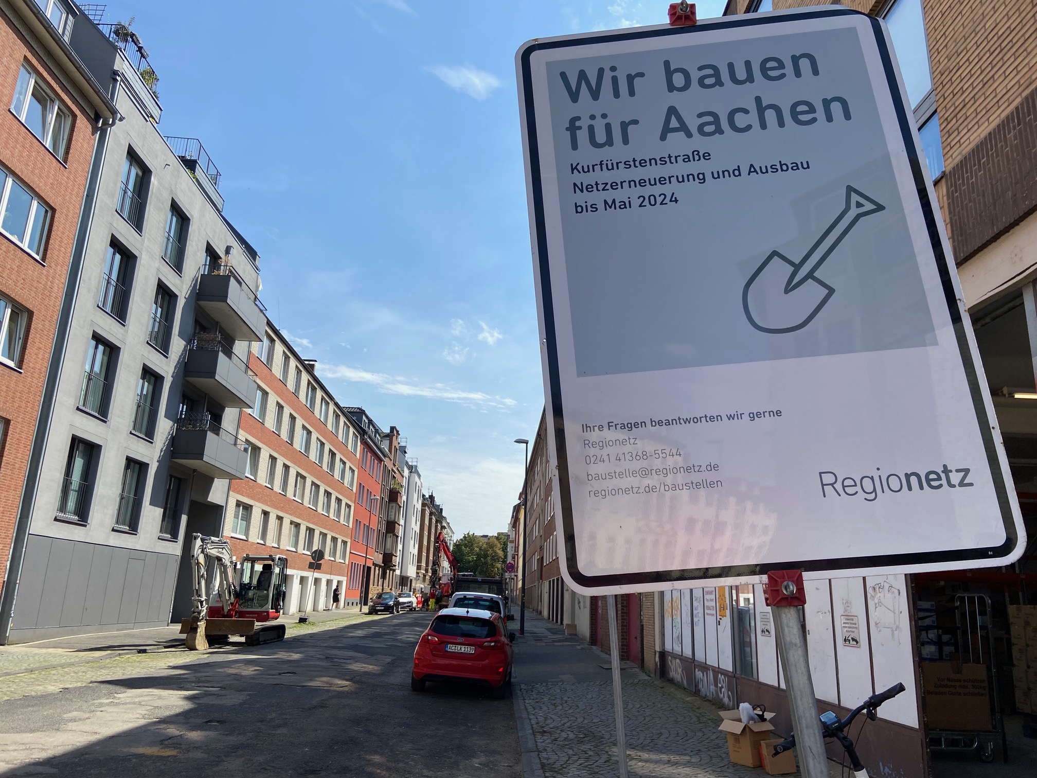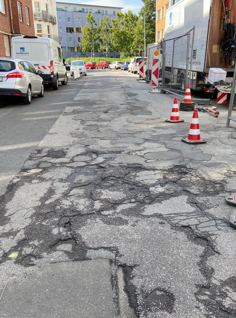 Die kaputteste Straße von Aachen, also die Kurfürstenstraße, wird saniert. Dort wird Fernwärme verlegt, damit man winters mit Wärme aus dem Kraftwerk Weisweiler (wird allerdings 2029 abgeschaltet) preiswert heizen kann. Außerdem werden Versorgungsleitungen für Gas, Wasser, Strom verlegt. Ein paar Bäume werden in der seit Ewigkeiten absolut baumlosen Straße gepflanzt und Fahrradbügel aufgestellt. Dauer der Arbeiten: mindestens ein Jahr.