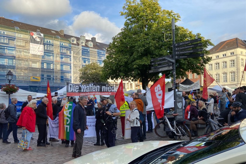 Vor der Preisverleihung demonstrierte am Elisenbrunnen und auf dem Markt – eingezwängt zwischen die Buden der Kunsthandwerker – ein sogenanntes Antikriegsbündnis. Ein Redner schimpfte vor knapp 80 Personen hauptsächlich auf die NATO und die Grünen, die angeblich den Krieg verlängern würden.