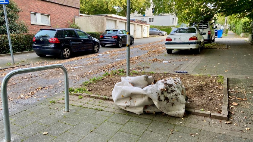 Besonders eine bestimmte Baumscheibe haben sich die Anwohner der Straße als Müll-Abwurfstelle ausgesucht. Dort türmen sich im Laufe einer Woche immer mehr prallvolle, gelbe Säcke. Wer in seinem Haushalt einen gelben Sack mit Plastikmüll voll bekommen hat, rennt runter auf die Straße und stellt den Sack an den Baum.