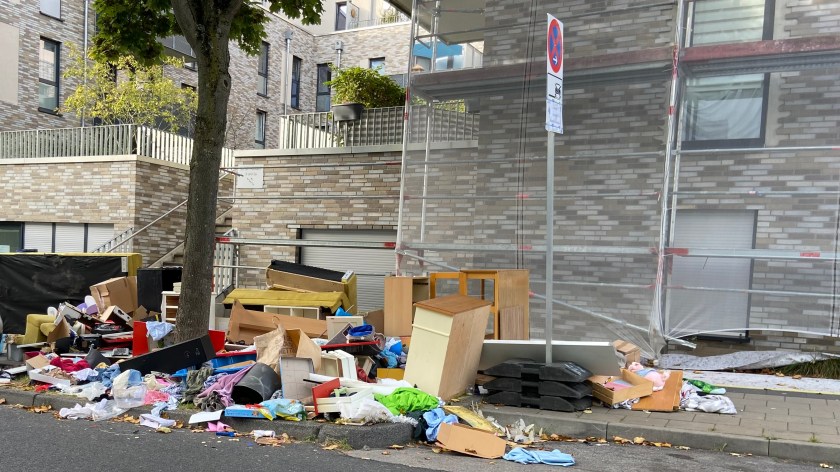 Wenn montags die gelben Säcke abgeholt worden sind, bleibt noch jede Menge anderer Müll übrig. Und es sieht dann aus wie auf den Foto oben. Krass. Das stört etliche Anwohner*innen gewaltig. Mit den Massen sind übrigens selbst die Leute vom Stadtbetrieb überfordert.