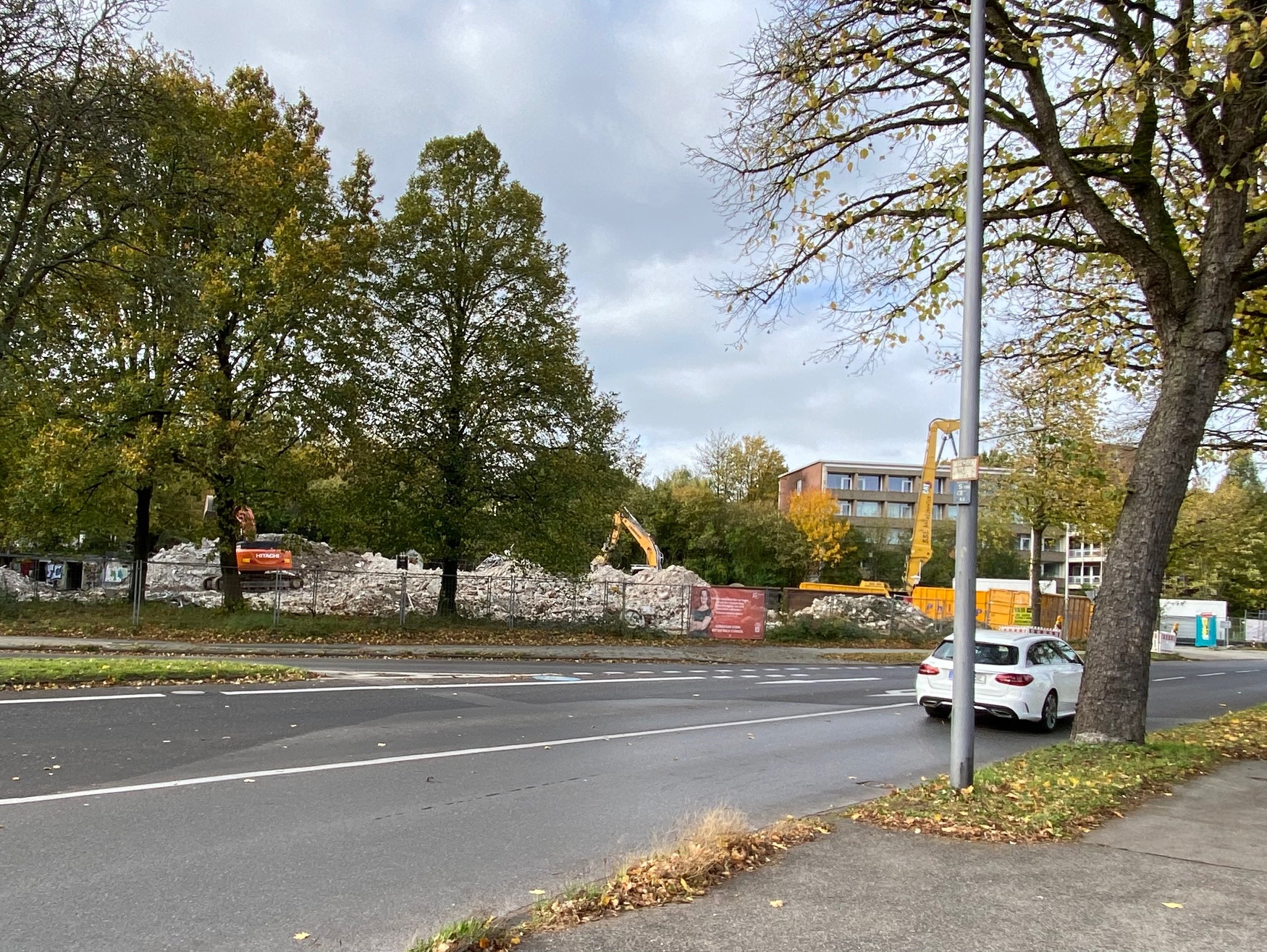 Endlich. Der alte Kasten, der einst eine „Straßenbauamt“ genannte Behörde beherbergte (in der Aachener Karl-Marx-Allee 220) existiert nicht mehr. Das Gebäude, das zuletzt nur noch eine Ruine war, ist abgerissen worden. Es hatte für jede Menge Ärger zwischen Stadt Aachen und Land NRW gesorgt. Zur Erinnerung s. unten: So sah es noch im August diesen Jahres an der Ecke aus.