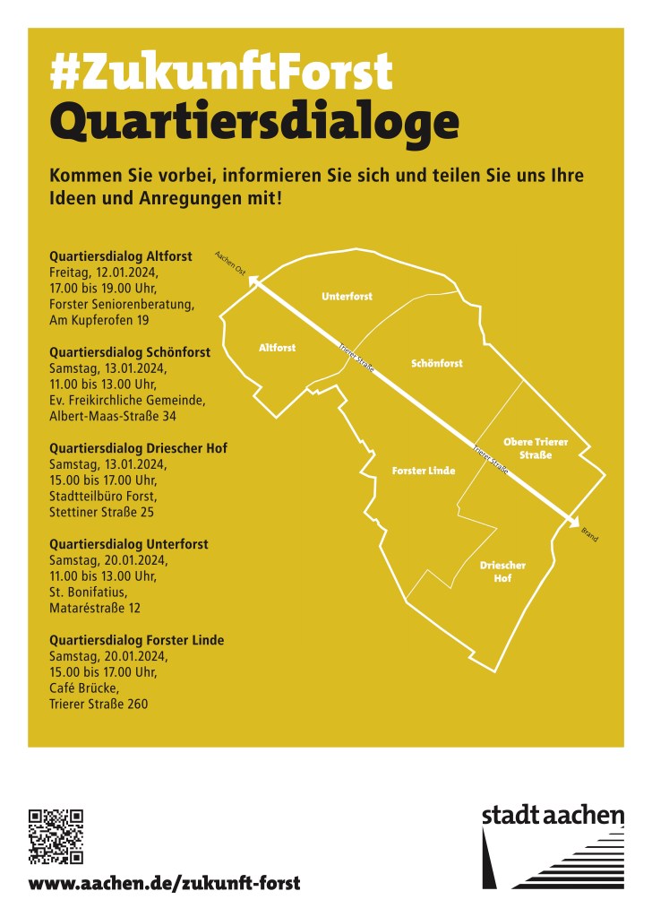 Die Zukunft dieses großen Aachener Stadtgebiets wird gestaltet, es ist Forst mit seinen verschiedenen Teilräumen Unterforst, Altforst, Schönforst, Forster Linde, Obere Trierer Straße und Driescher Hof. Um dieses große Gebiet lebens- und liebenswert zu machen, hat sich die Stadtverwaltung gemeinsam mit der Politik und zahlreichen weiteren Akteur*innen im Frühjahr 2023 auf den Weg gemacht. Potenziale in den 6 Quartieren sollen gestärkt und die Lebens-, Wohn- und Arbeitsbedingungen im gesamten Gebiet verbessert werden.
