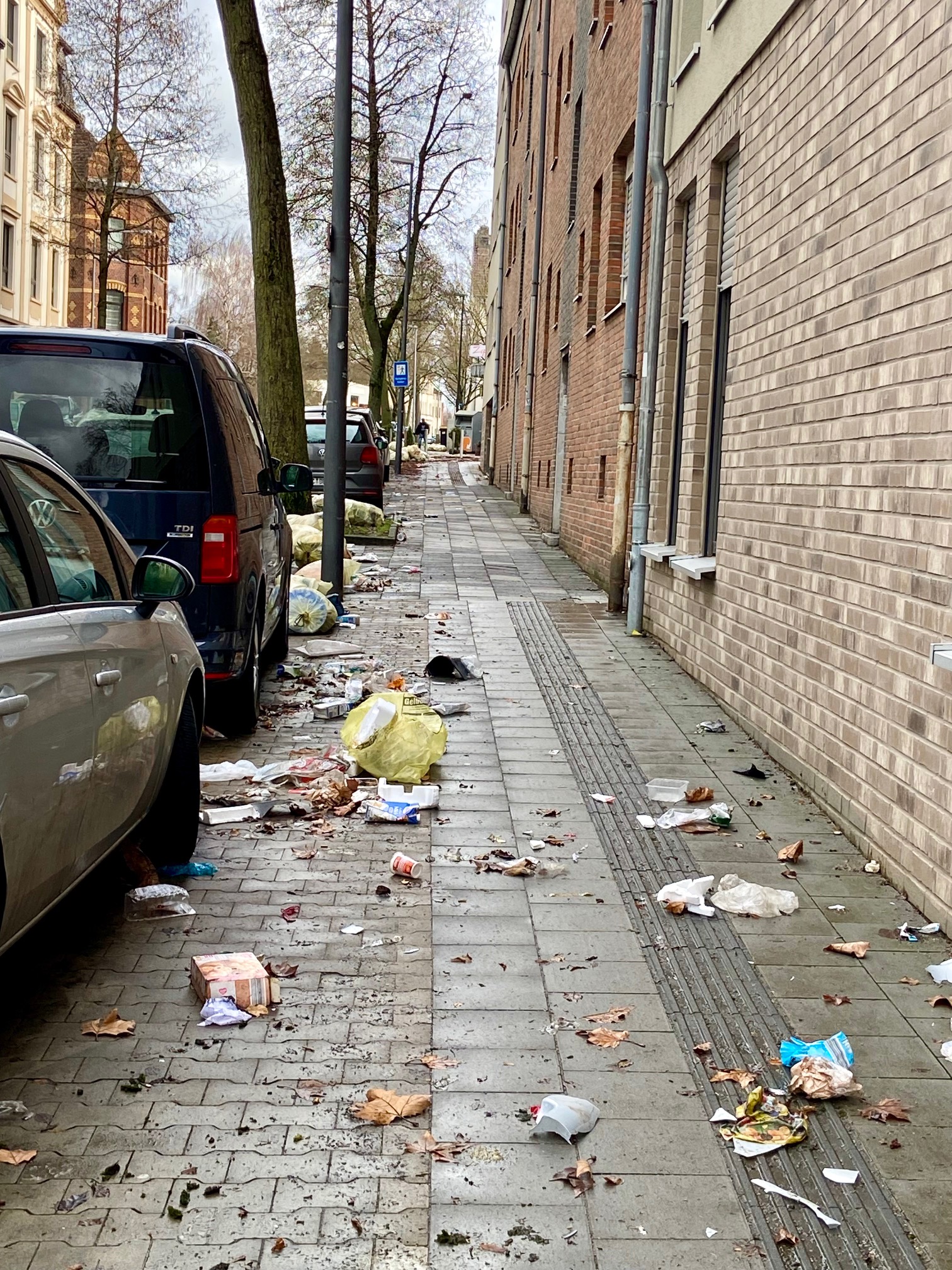 Kaum hat der vorausgesagte Sturm eingesetzt, stellen die Anwohner im Freunder Weg wieder abends ihre Gelben Säcke raus. Dass sich das ganze Plastikzeug nachts über die Straße verteilt, stört die Anwohner nicht. Sie verlassen sich auf die Mitarbeitenden vom Stadtbetrieb und kümmern sich um nichts. Keine gute Einstellung. Was kann der Grund sein für so viel Gleichgültigkeit gegenüber der Sauberkeit?