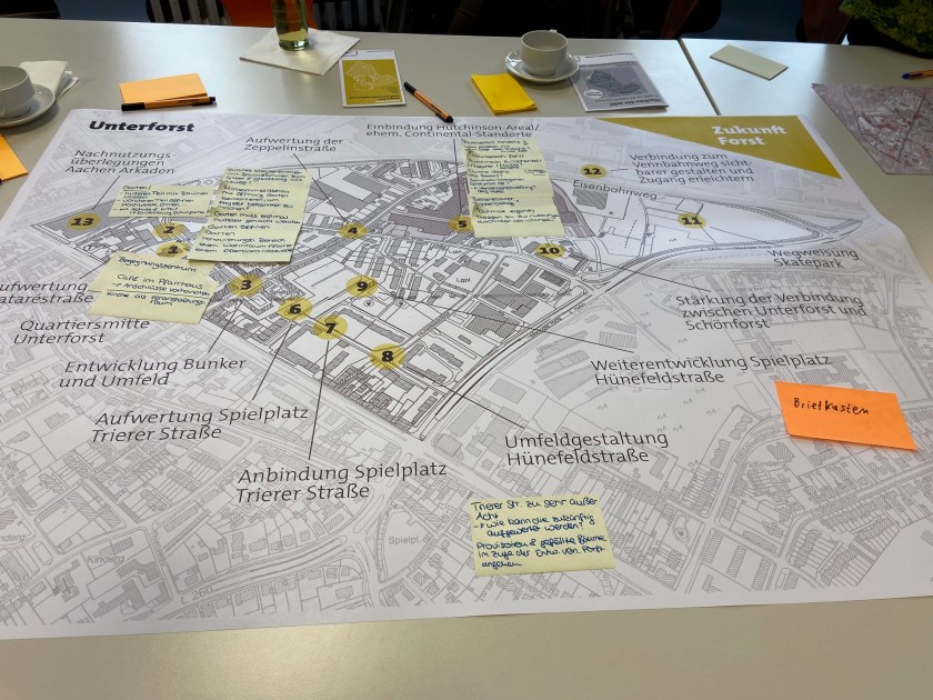 Zurück nach Aachen. Hier arbeitet man mit großem Eifer an der Frage, was aus Aachens Ortsteil Forst einmal werden soll. Es machen viele Leute mit, sie bleiben dran. Die Stadtverwaltung erklärt, was geht und was nicht geht und hilft mit viel Personal wo immer es nötig ist. Man kann jetzt schon etliches verbessern im Stadtteil, und sollten die Millionen Euro aus Düsseldorf erst einmal kommen, dann noch mehr.