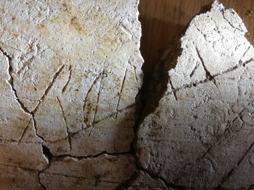 Links: Fernweh oder Heimweh? Ein in den Wandputz geritztes Graffito „ROMA“ aus der Krämerstraße in Aachen.