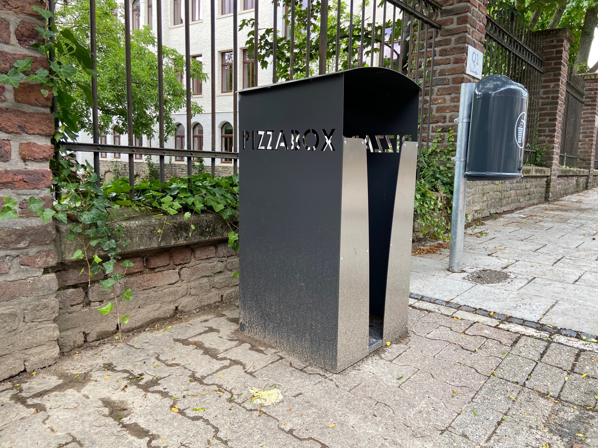 Am Rande des Spielplatz: eine Pizzabox. Pizzakartons landen oft falsch im Papiercontainer, sind aber kein Papier.