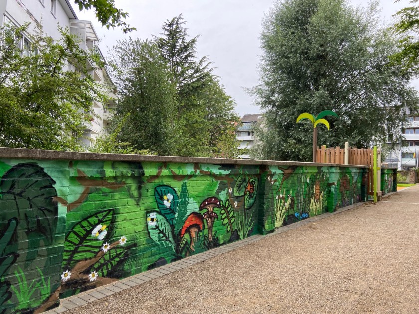 Schatten spenden alte Bäume, 5 hochstämmige Schattenspender wurden zusätzlich gepflanzt, dazu Bambus, Gräser und Stauden. Auf den Mauern dürfen wir eine Farbexplosion bewundern. Aachener Graffiti-Künstler*innen, ein Kunst- und Jugendprojekt und Leute aus der Bleiberger Fabrik waren dort aktiv.
