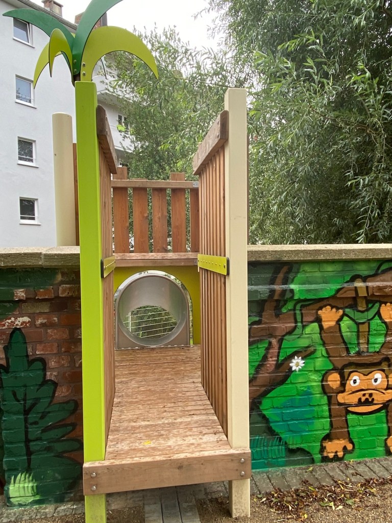 Nach einer Bürgerbeteiligung mit auffallend vielen Kindern, legte die Verwaltung los. Hauptattraktion ist die Kletteranlage „Dschungel“, das Trampolin kommt auch immer gut an bei Kita-Kindern und Grundschulkindern. Es gibt dort auch Picknicktische und Bänke.