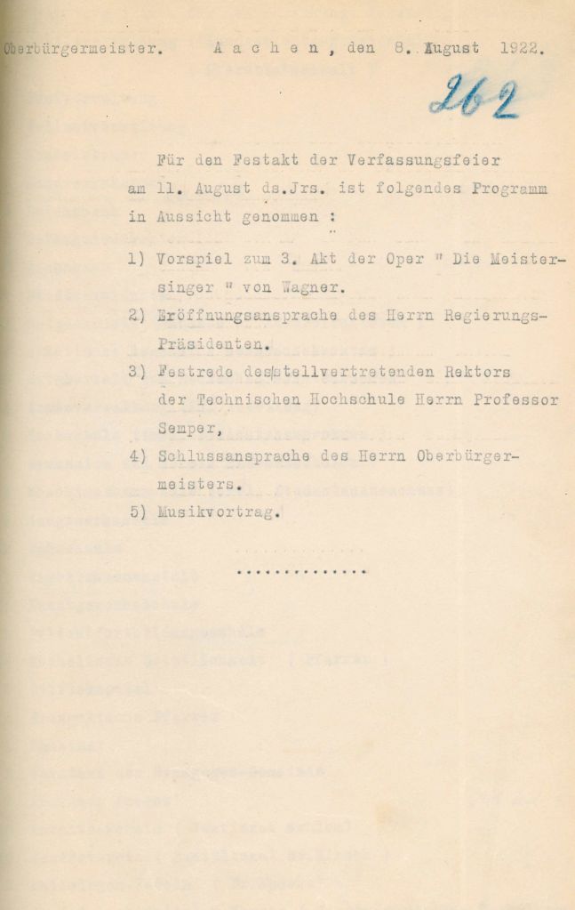 Das Aachener Stadtarchiv stellt regelmäßig und dankenswerterweise interessante Stücke als Archivale des Monats vor. In diesem August zeigt das Archivale des Monats ein Konzept von Oberbürgermeister Wilhelm Farwick vom August 1922 für das geplante Programm der ersten Verfassungsfeier in Aachen.