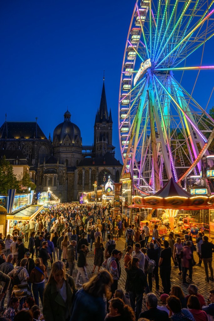 Das Riesenrad, der Dom im Hintergrund und jede Menge Menschen auf dem Katschhof: Es ist wieder September in Aachen. Auf den Elisengarten passte gestern keine Maus mehr drauf, so dicht standen die Menschen, um „invisible touch“ zu erleben – tatsächlich ein Fest für Augen und Ohren. Foto: Henning Brinkmann