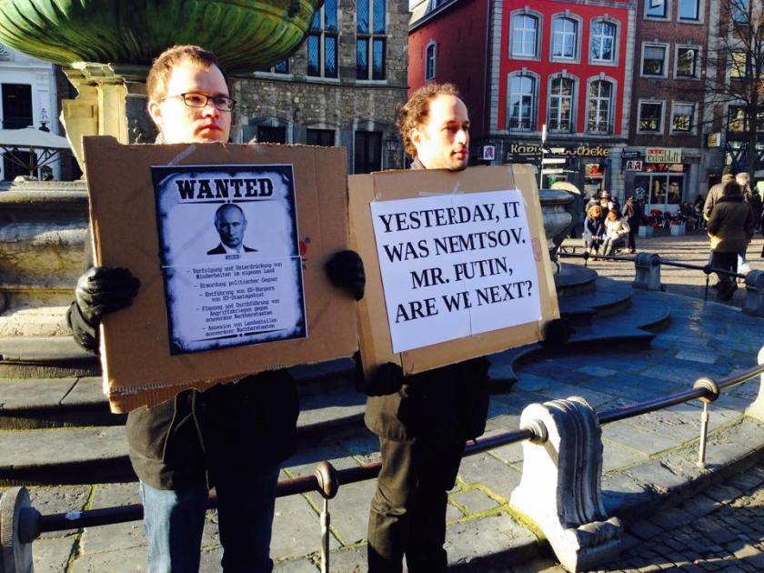 In Aachen gibt es im März 2015 einen Protest. Auf dem Wanted-Plakat steht, was Putin vorgeworfen wird:
