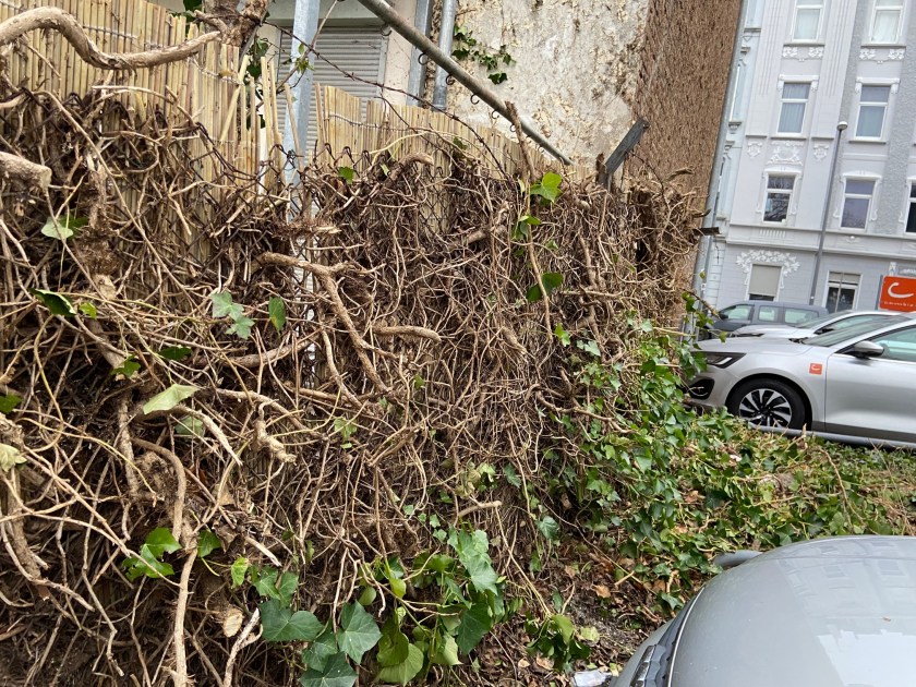 Viele Jahre lang hat sich niemand am Wachstum der Pflanze gestört. Plötzlich muss alles weg. Da baut klein Vöglein mehr sein Nest, viele kleine Tierarten haben keinen Lebensraum mehr, im Haus verschlechtert sich das Wohnklima, kein Hitzeschutz, kein Wärmepolster, Lärm wird nicht mehr geschluckt.