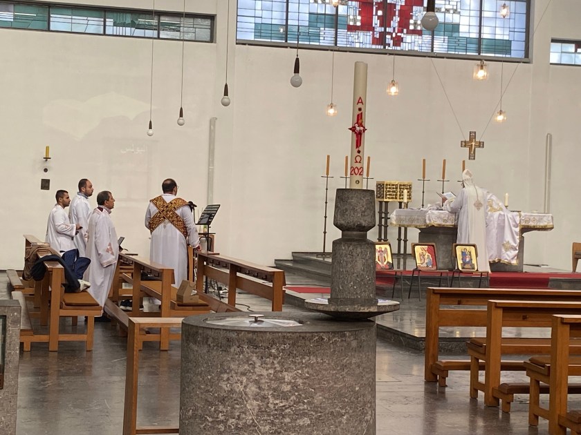 In der Kirche zelebrieren seit dem Sommer 2024 an Samstagen und Sonntagen hintereinander katholische Christen, koptisch-orthodoxe Christen und neuapostolische Christen ihre Messen. An Ostern wird das ein ganz schönes Gedränge, aber man konnte sich einigen.
