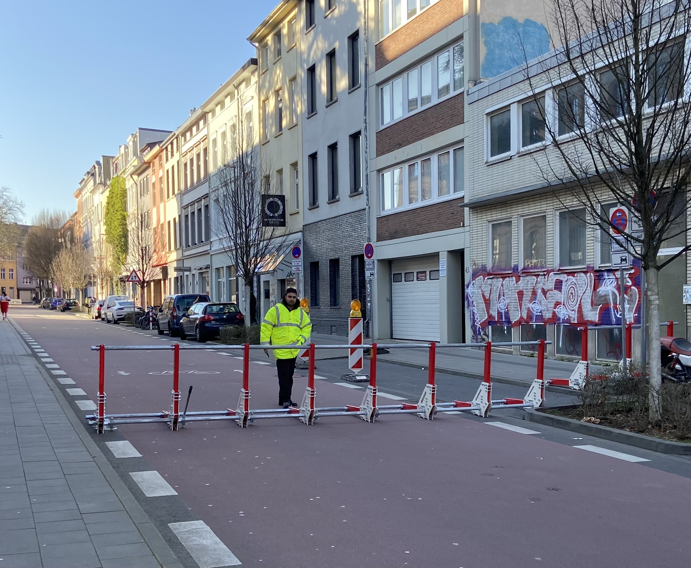 Und weil das letzte Restchen Straße auch noch abgesperrt werden musste, waren zuvor noch Extra-Sperren angeschafft und aufgestellt worden. Mehr als 15 Meter weit, so war zu erfahren, würde ein schwerer Wagen nicht kommen können, ohne dass ihn die Speichen zum Stehen bringen würden. Zum Glück gab es in Aachen, anders als in Mannheim, da nichts auszuprobieren. There is no glory in prevention, wie wir seit ein paar Jahren wissen. Man fühlt sich einfach nur sicher.
