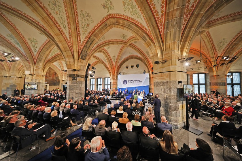 Die Preisträgerin sprach von drei bedeutenden Denkmälern in Aachen, die von der Geschichte und Bedeutung Europas zeugen. Zunächst der Aachener Dom, ein einzigartiges Zeugnis der geistigen, kulturellen und politischen Renaissance Europas, angestoßen durch die Vision Karls des Großen. Seine Idee für Europa sei es gewesen, einen Raum zu schaffen, in dem sich Wissenschaft und Kultur, Bildung und Rechtstaatlichkeit entfalten können.