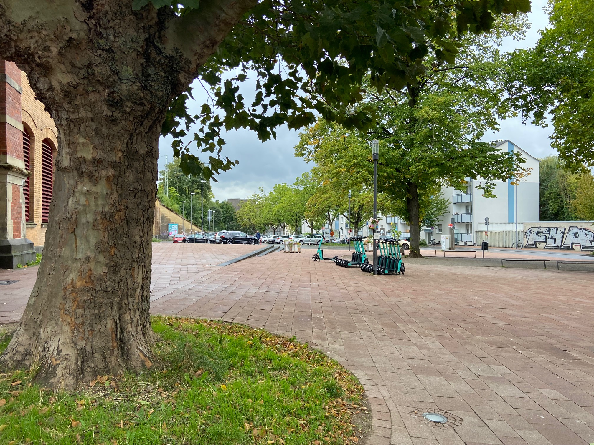 Auf dem Platz (auf dem Foto hinten, wo die Autos stehen) wird also kein Gebäude hochgezogen. In dem Quartier ist ja ohnehin alles schon so voll- und zugebaut, dass man sich über den Erhalt einer nicht-bebauten Fläche nur noch freuen kann. Ein weiter Blick bleibt weiter möglich, ein frischer Luftstrom desgleichen. Die Bäume werden stehen bleiben.