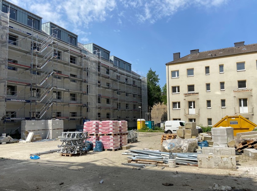 Derzeit werden nach einem jahrelangen Planungsprozess in der Zeppelinstraße 128 Wohnungen in mehreren Gebäudekomplexen totalsaniert. Seit Ende 2022 geht es rund in den Gebäuden aus dem Jahr 1929. Sie gehören der Stadt Aachen, werden von der GeWoGe verwaltet und werden eines Tages zu erschwinglichen Mieten vermietet. 35 weitere Wohnungen sind obendrauf neu gebaut worden.