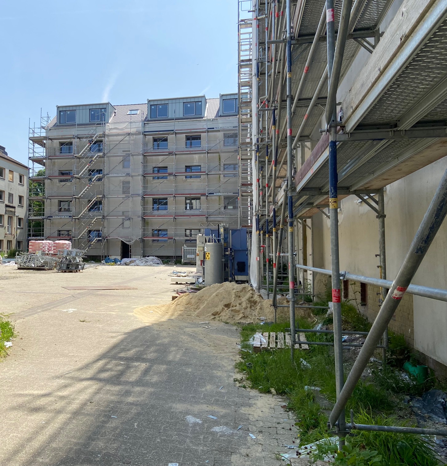 Derzeit werden nach einem jahrelangen Planungsprozess in der Zeppelinstraße 128 Wohnungen in mehreren Gebäudekomplexen totalsaniert. Seit Ende 2022 geht es rund in den Gebäuden aus dem Jahr 1929. Sie gehören der Stadt Aachen, werden von der GeWoGe verwaltet und werden eines Tages zu erschwinglichen Mieten vermietet. 35 weitere Wohnungen sind obendrauf neu gebaut worden.