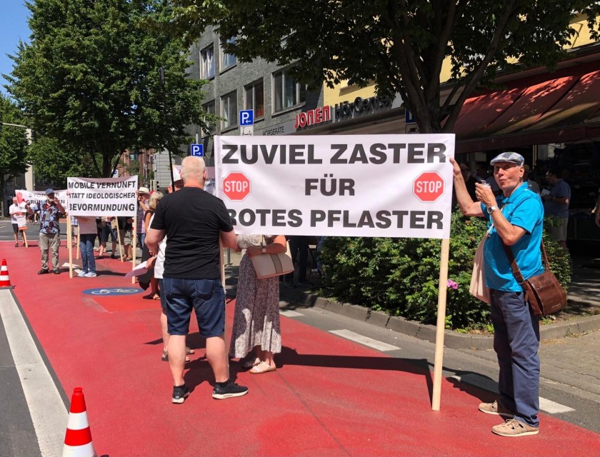 Etwa 40 Personen standen bei der Kundgebung eine Stunde lang in sengender Hitze auf der Straße, weil ihnen Teile der aktuellen Aachener Verkehrswende nicht passen. Die Wende manifestiert sich z. Z. an der Kreuzung Jakobstraße/Löhergraben/Karlsgraben, wo dem Radverkehr neuerdings besonders viel Platz eingeräumt und der Pkw-Verkehr in Richtung stadtauswärts geleitet wird.