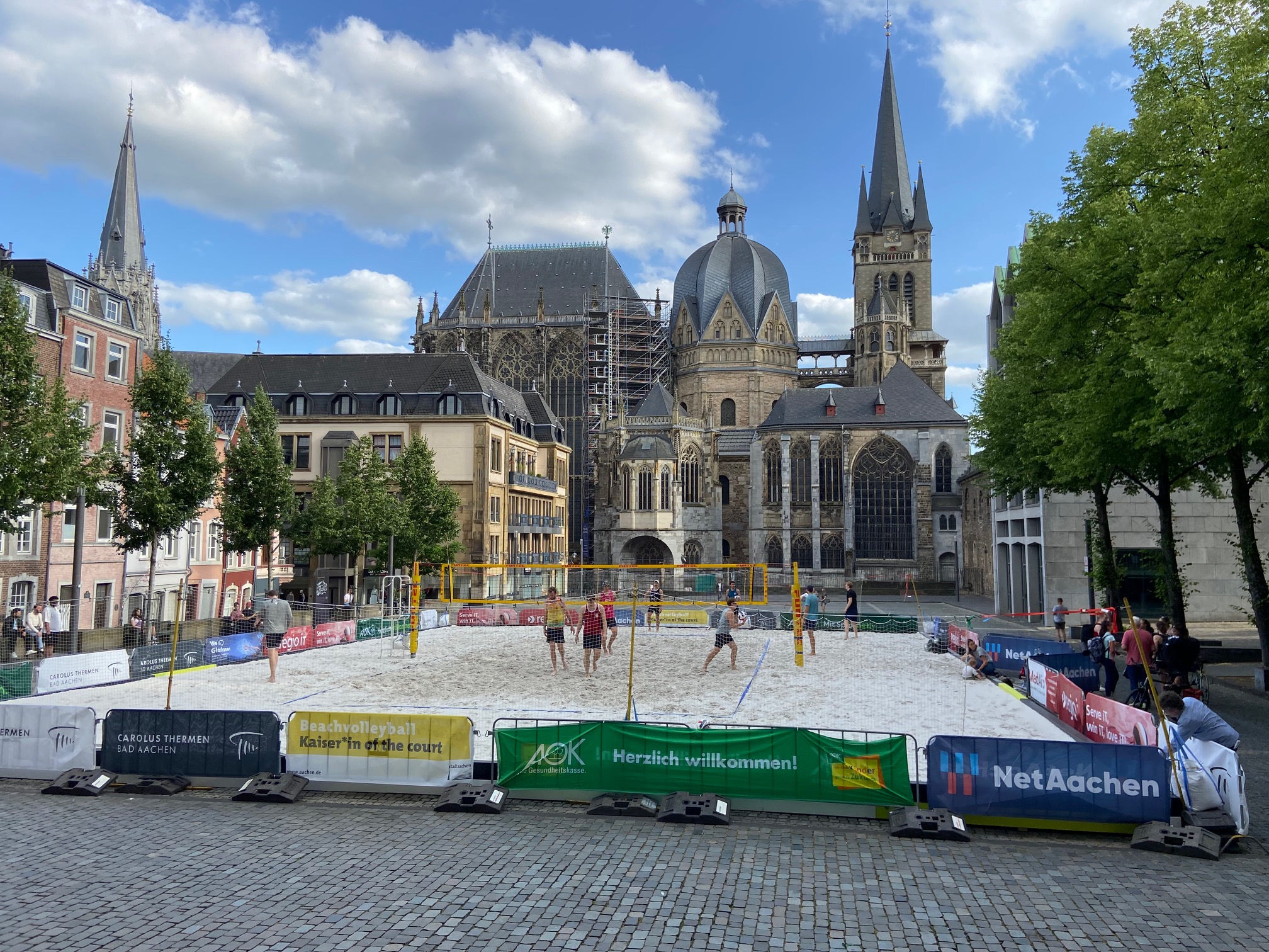 Heute, 25. Juni, von 16 bis 22 Uhr findet zwischen Dom und Rathaus ein internationales Turnier statt, 5 Teams treten gegeneinander an. Alles aufgebaut hat wieder der Stadtbetrieb. Betriebsleiterin Indra Balsam berichtet, man habe für maximale Sicherheit gesorgt, „der Sand wird täglich kontrolliert“.