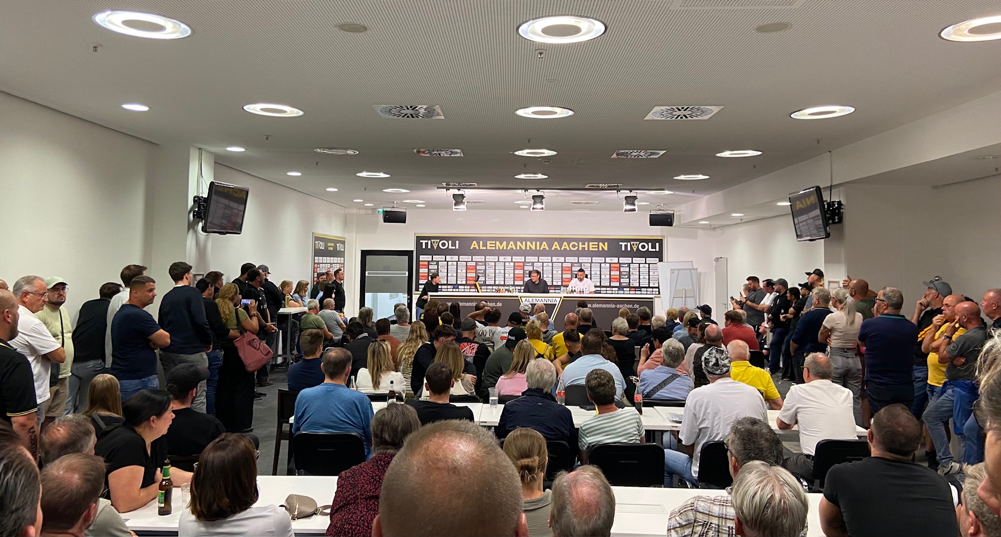 Jede Menge Fans waren gestern zugegen, als sich im Presse-Saal der Alemannia der neue Trainer Benedetto Muzzicato vorstellte und ausführlich seine Ideen und Pläne zum Fußball in Aachen erläuterte. Alle Fragen wurden beantwortet, Muzzi hinterließ einen guten, sympathischen Eindruck.