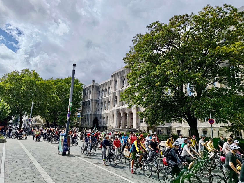 2.000 sollen es gewesen sein, die am Samstag – auf Rädern – für die Mobilitätswende in Aachen demonstrierten. Langsam – fast ständig im Schritttempo – bewegte sich die gigantische Kolonne durch Aachen, gelangte vom Hauptbahnhof über 8 Kilometer zum Westpark und wurde von Passanten und aus den Häusern umfassend gefilmt, wie es schien.