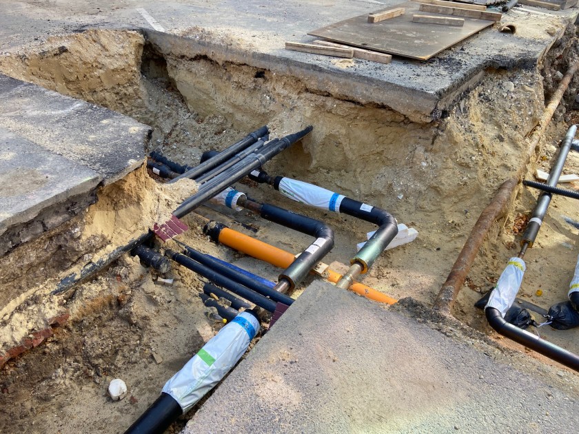 Wahllos ein Schuss in eine Aachener Baustelle hinein. So sieht es unter Aachens Straßen aus, in der Mitte der Straße wie auch am Rande. Hunderte von Kilometern Rohre, Rohre, Rohre verlegt, die meisten viel dicker als die hier abgebildeten.