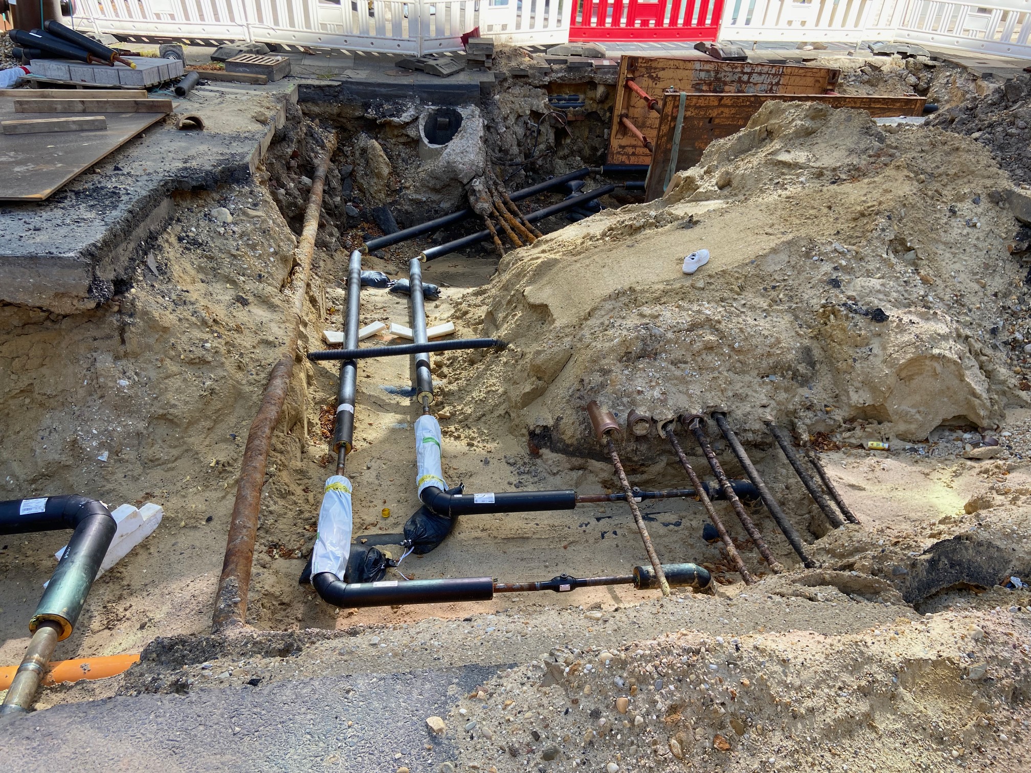 Wahllos ein Schuss in eine Aachener Baustelle hinein. So sieht es unter Aachens Straßen aus, in der Mitte der Straße wie auch am Rande. Hunderte von Kilometern Rohre, Rohre, Rohre verlegt, die meisten viel dicker als die hier abgebildeten.