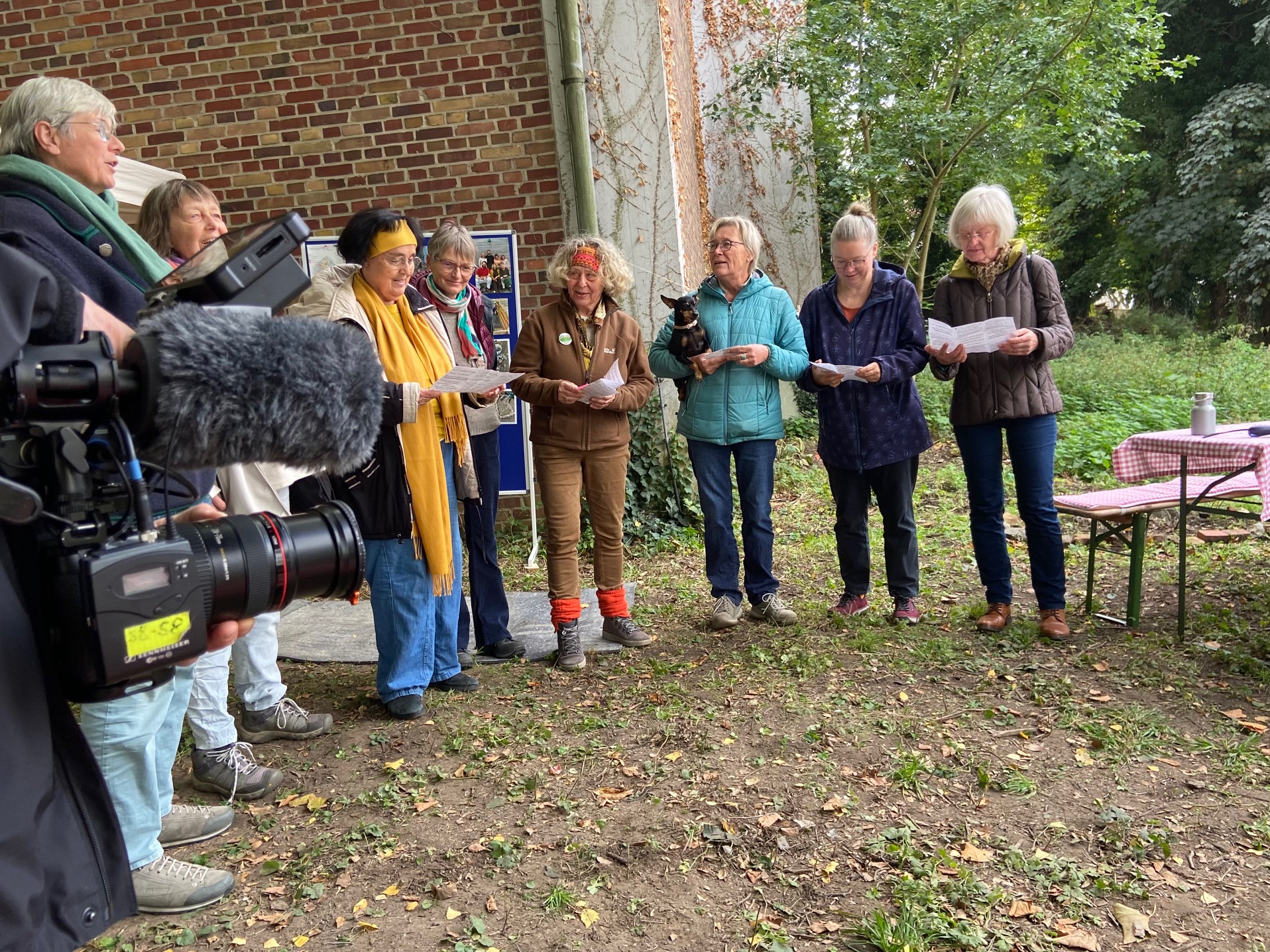 Mit einer Gesangseinlage wurde das Fest eröffnet. Die Mitglieder des Wohnprojekts LebensWeGe Aachen e.G. haben die Angewohnheit, draußen zusammen zu singen, aus der Corona-Zeit ins Jahr 2025 hinübergerettet.