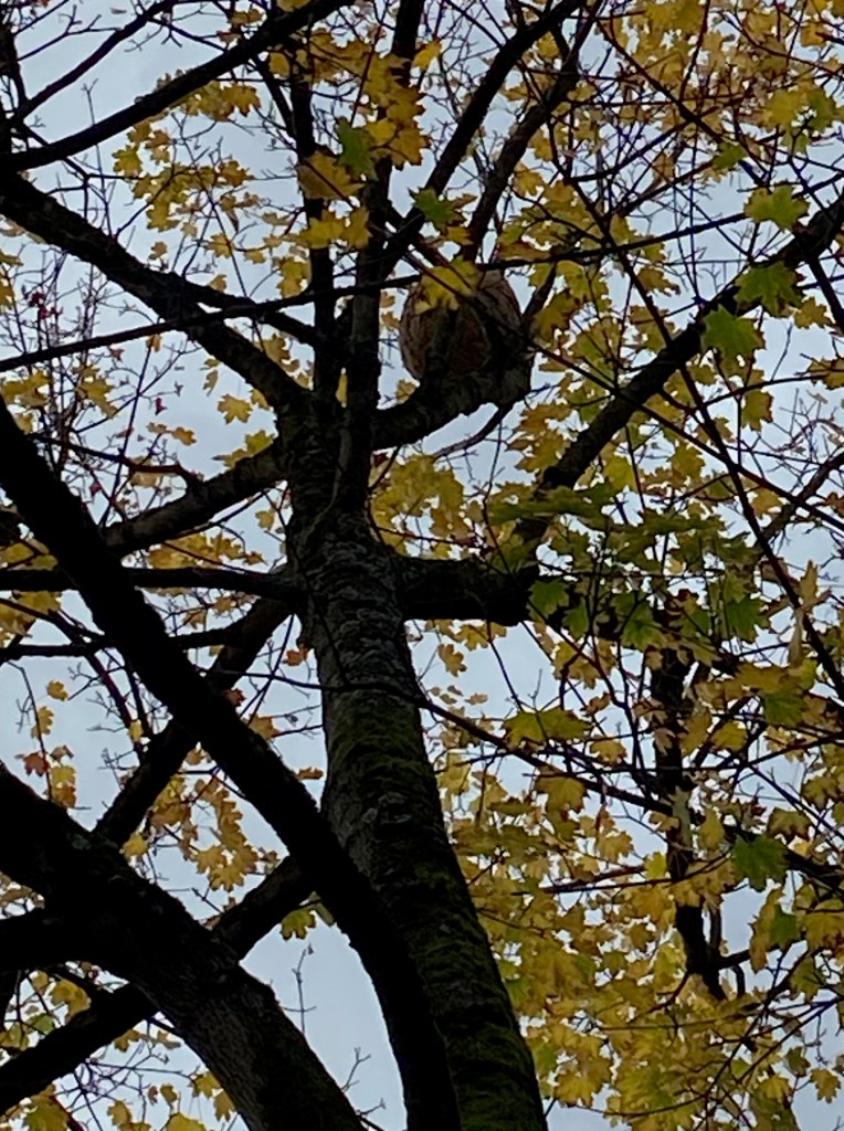 Kaum hat man sich mal ein bisschen über Hornissen und über die sog. Asiatische Hornisse informiert, fällt einem hoch oben was auf: Das könnte doch ein Hornissennest sein? Schnell mal das Handy gezückt, knips und das Foto weitergeleitet, denn die Nester sind meldepflichtig. Offenbar wollen die Behörden wissen, wie weit diese Tierchen sich verbreitet haben.