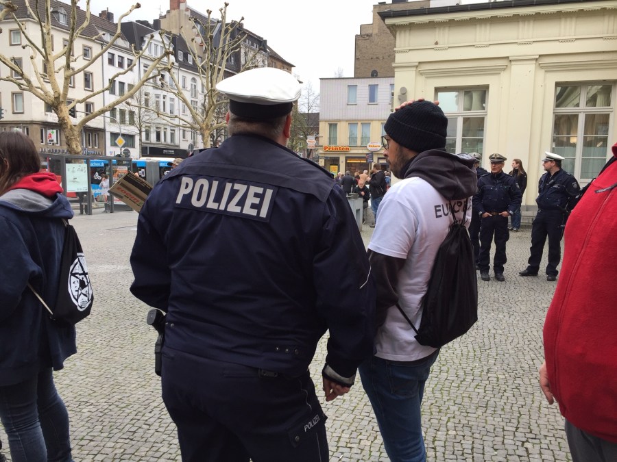 Vor der Demo: Marc Teuku, Sprecher der Fraktion der Piratenpartei im Rat der Stadt klärt mit der Polizei noch Einzelheiten zum Weg, den die Demonstration nehmen wird.