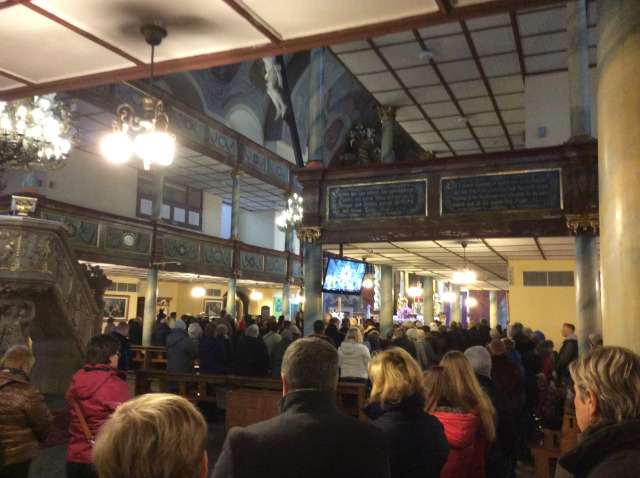 Eine von mehreren Messen, die sonntags in der prächtig ausgestatteten Kirche gefeiert wurden. Die Wände schmückten Bibeltexte in deutscher Sprache. Alles war in einem guten Zustand.