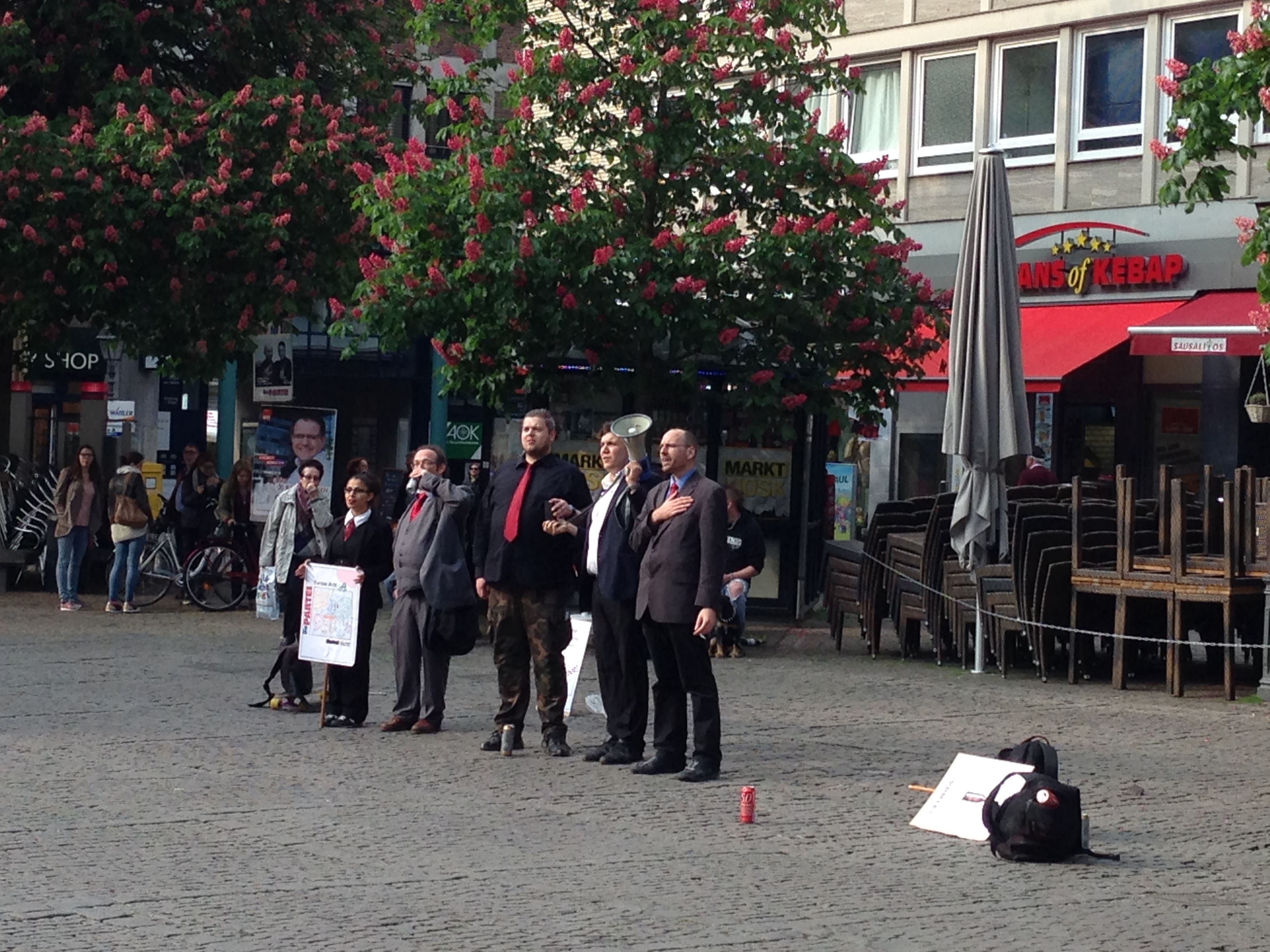 „Die Partei“ machte auf dem Markt Programm. Es wurde gesungen und allen Freibier versprochen, „wenn wir an der Macht sind“.