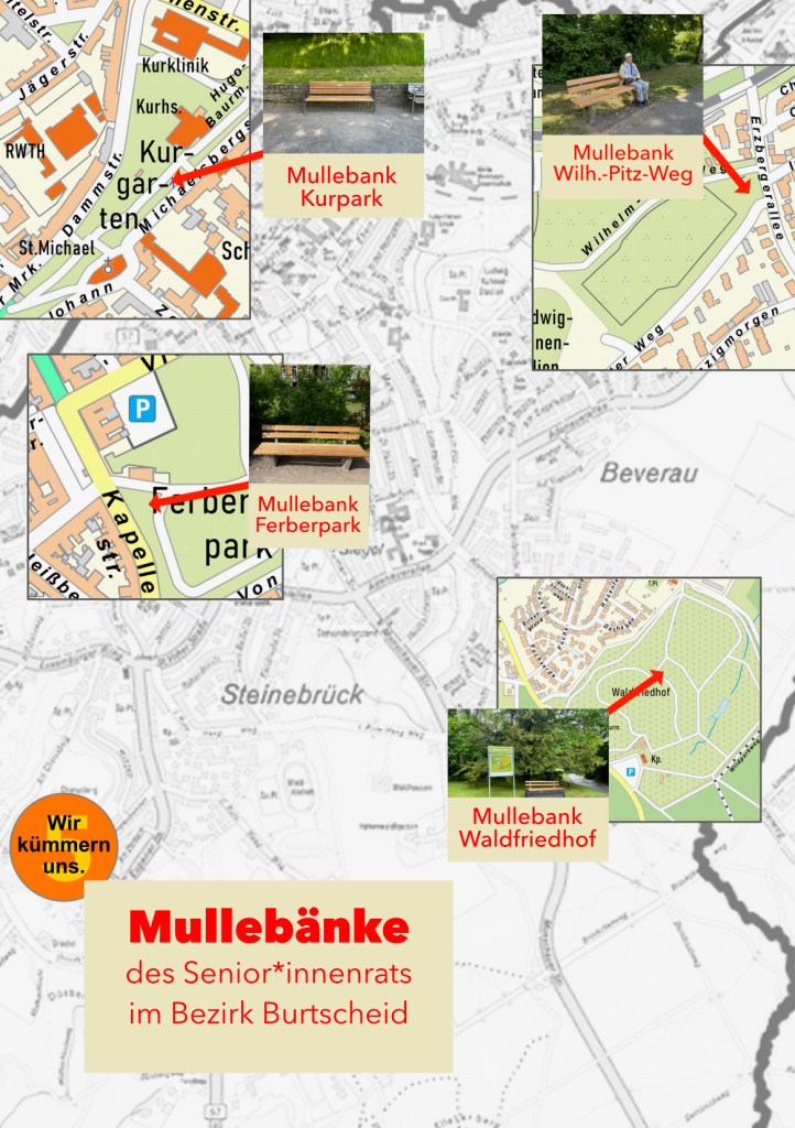 Die Bänke alleine sind aber kein Selbstläufer. Deshalb sitzt je ein Vertreter des Senior*innenrats Burtscheid montags in der Zeit 15 bis 16 Uhr auf eine der vier Mullebänke des Sozialraums Burtscheid. Dazu wird versprochen: „Wir motivieren Passant*innen, uns ihre Geschichten zu erzählen. Wir hören zu und nehmen aber auch gerne Anregungen für unsere Arbeit mit. Und natürlich verlassen diese Informationen nicht die Mullebank.“