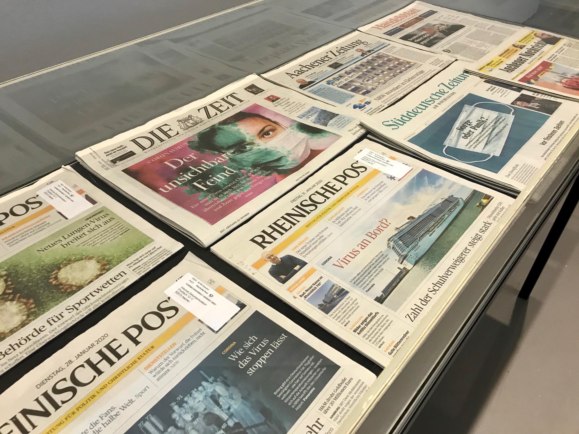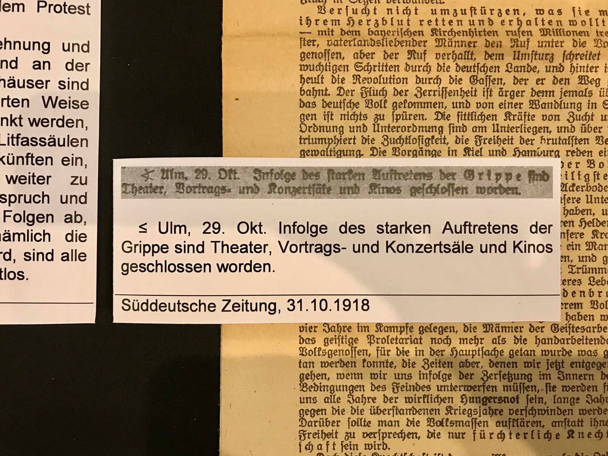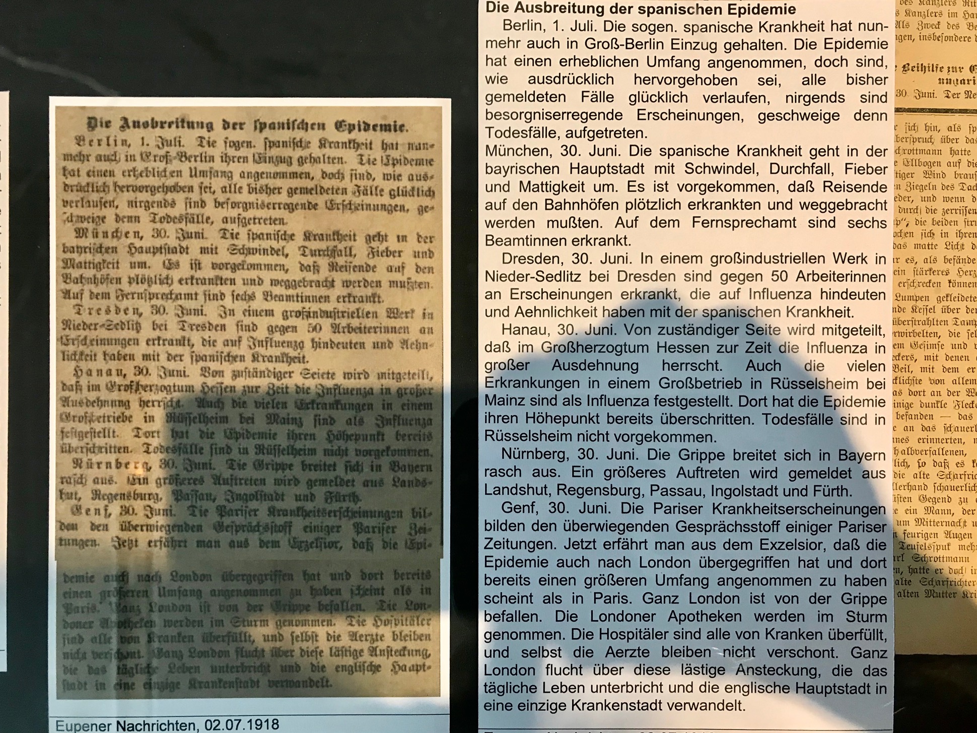 Eine sehr kleine Ausstellung hat das Zeitungsmuseum in der Pontstraße zusammengestellt. Dabei gibt es sozusagen nichts zu sehen, nur viel zu lesen. Das ist mühsam . . . aber mit ganz erstaunlichen Erkenntnissen verbunden. Man meint, die Stimmen der Corona-Verharmloser quasi im Originalton aus den ausgestellten Zeitungsartikeln der Jahre 1918/19 herauszuhören.