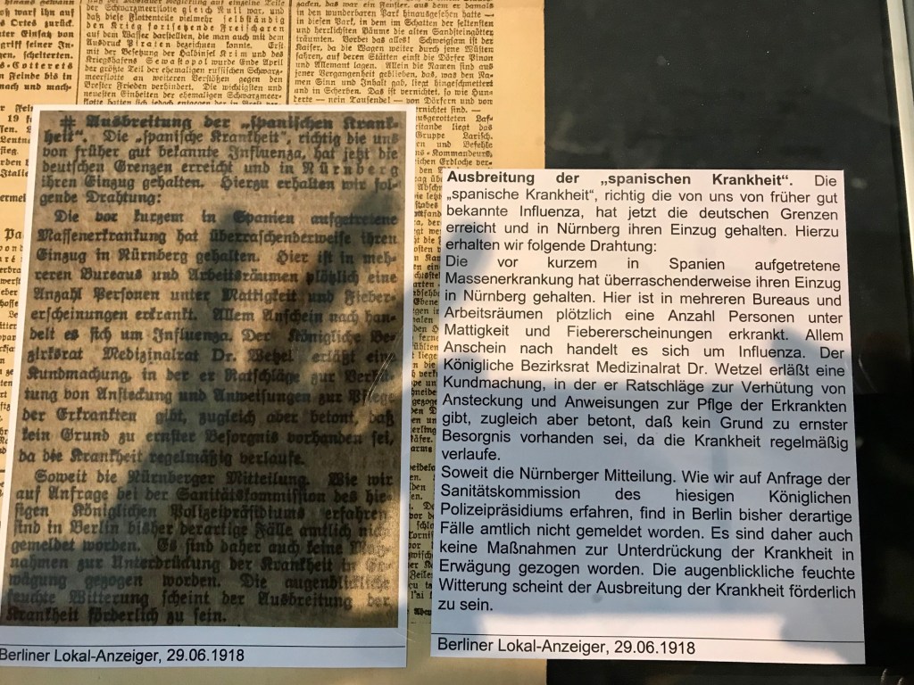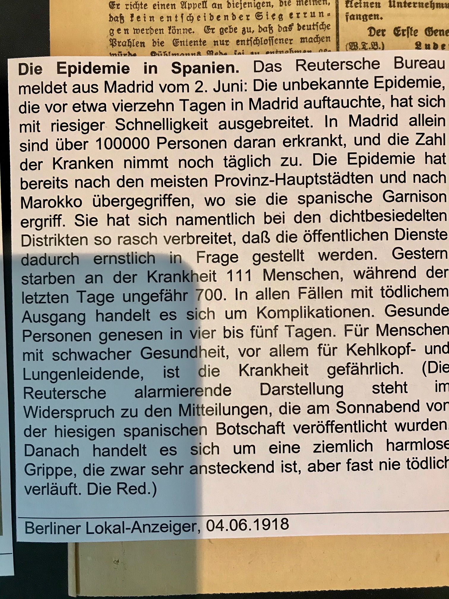 Wirrwarr in der Berichterstattung! Ist es nun „eine harmlose Grippe“ oder eine Krankheit, die nur für Schwache gefährlich ist oder doch für relevante Teile der Bevölkerung (Behörden) tödlich?News aus Berlin, München, Dresden, Hanau, Nürnberg, Genf. „Die Hospitäler sind alle von Kranken überfüllt.“Damals wie heute: manche Leute schwören auf homöopathische Mittel. Selbes Thema, anderes Jahrhundert. Heute sind die Zeitungen bunt und voller Bilder.