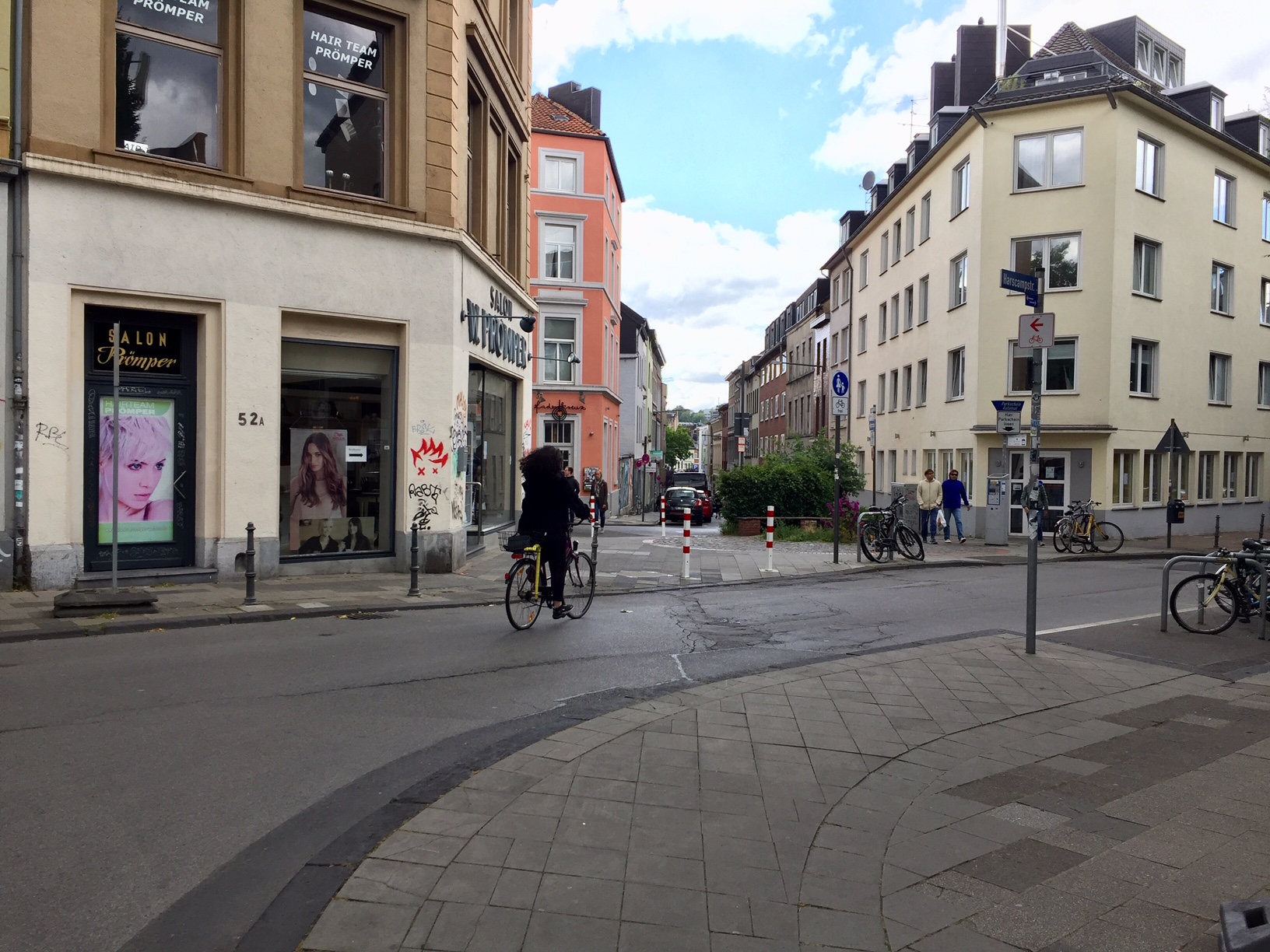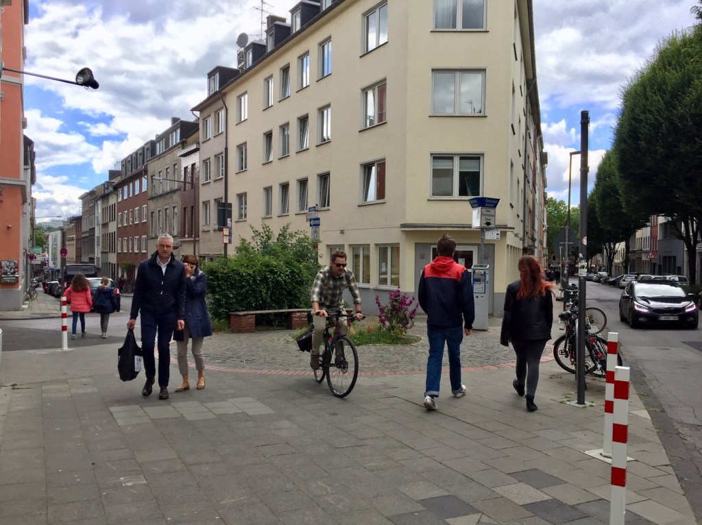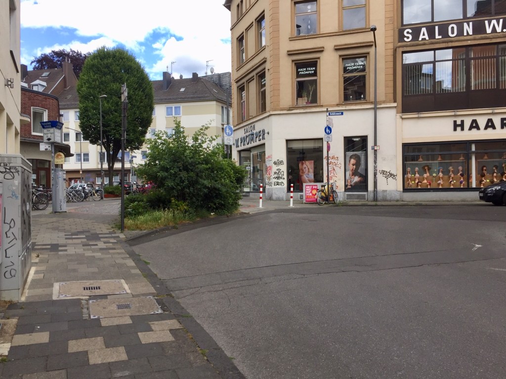 Der Platz ist nur ein Plätzchen und hat noch nicht mal einen Namen. Gleichwohl ist das dort eine schöne Ecke, unzählige Radfahrer aus dem Frankenberger Viertel fahren (aus der Lothringer Straße kommend) über diesen Platz in Richtung Dom, Rathaus und zur RWTH. Sie weichen Pkw und Fußgänger*innen aus, und es kommt zu Beinah-Unfällen.