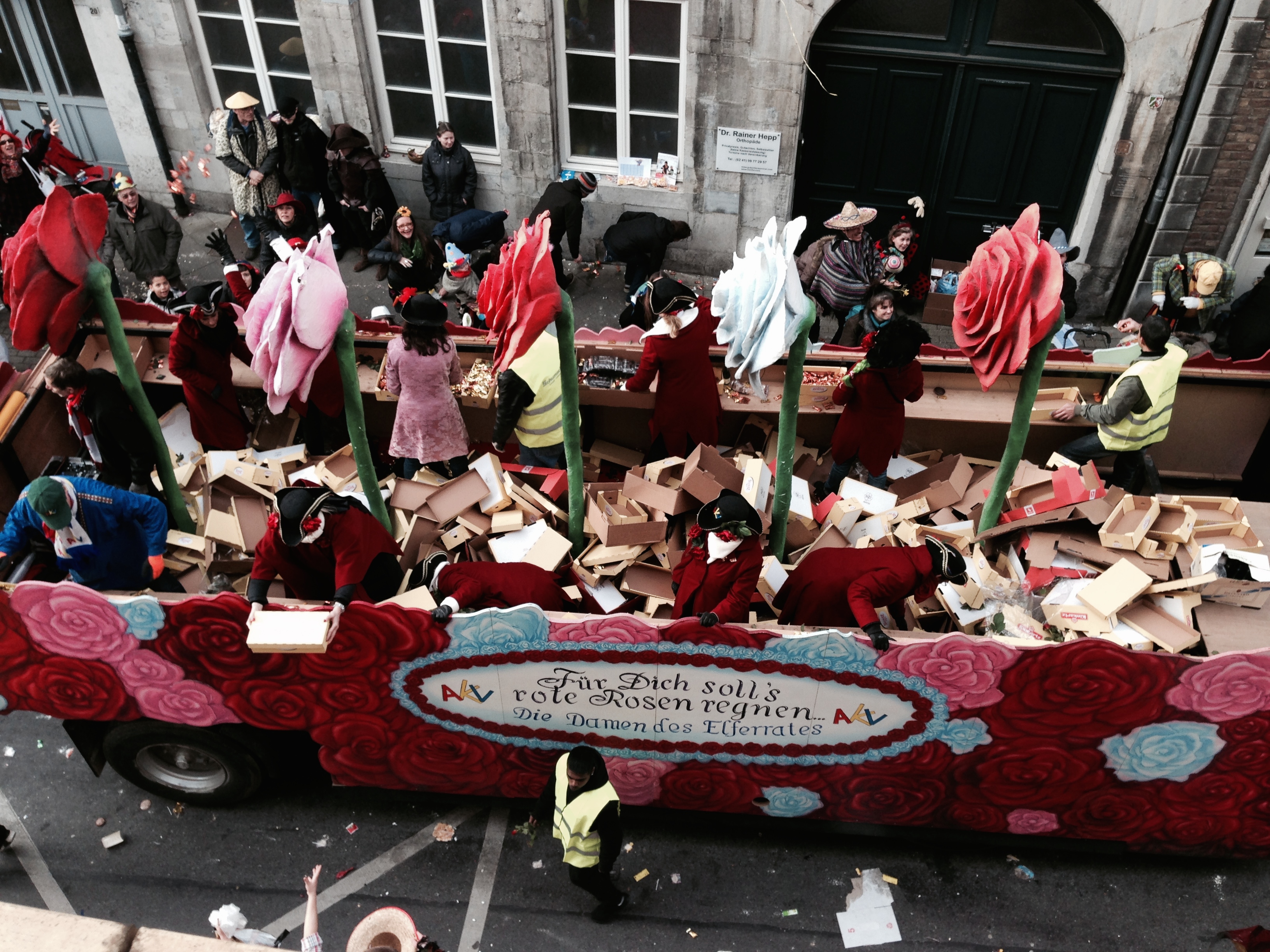 Die Stadtverwaltung hatte ihre schwersten Lkw aufgefahren, dazu Busse der ASEAG, Feuerwehrwagen und andere mehr um den Rosenmontagszug zu sichern. Außerdem war überraschend viel Polizei unterwegs.
