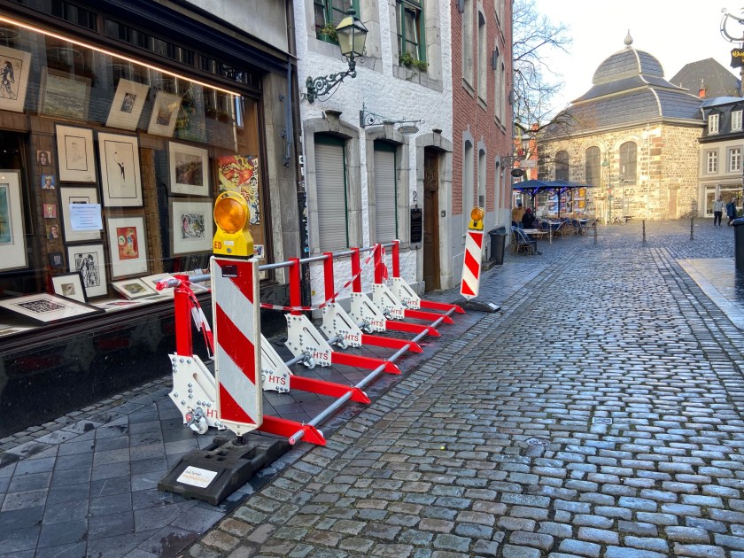 Und weil das letzte Restchen Straße auch noch abgesperrt werden musste, waren zuvor noch Extra-Sperren angeschafft und aufgestellt worden. Mehr als 15 Meter weit, so war zu erfahren, würde ein schwerer Wagen nicht kommen können, ohne dass ihn die Speichen zum Stehen bringen würden. Zum Glück gab es in Aachen, anders als in Mannheim, da nichts auszuprobieren. There is no glory in prevention, wie wir seit ein paar Jahren wissen. Man fühlt sich einfach nur sicher.